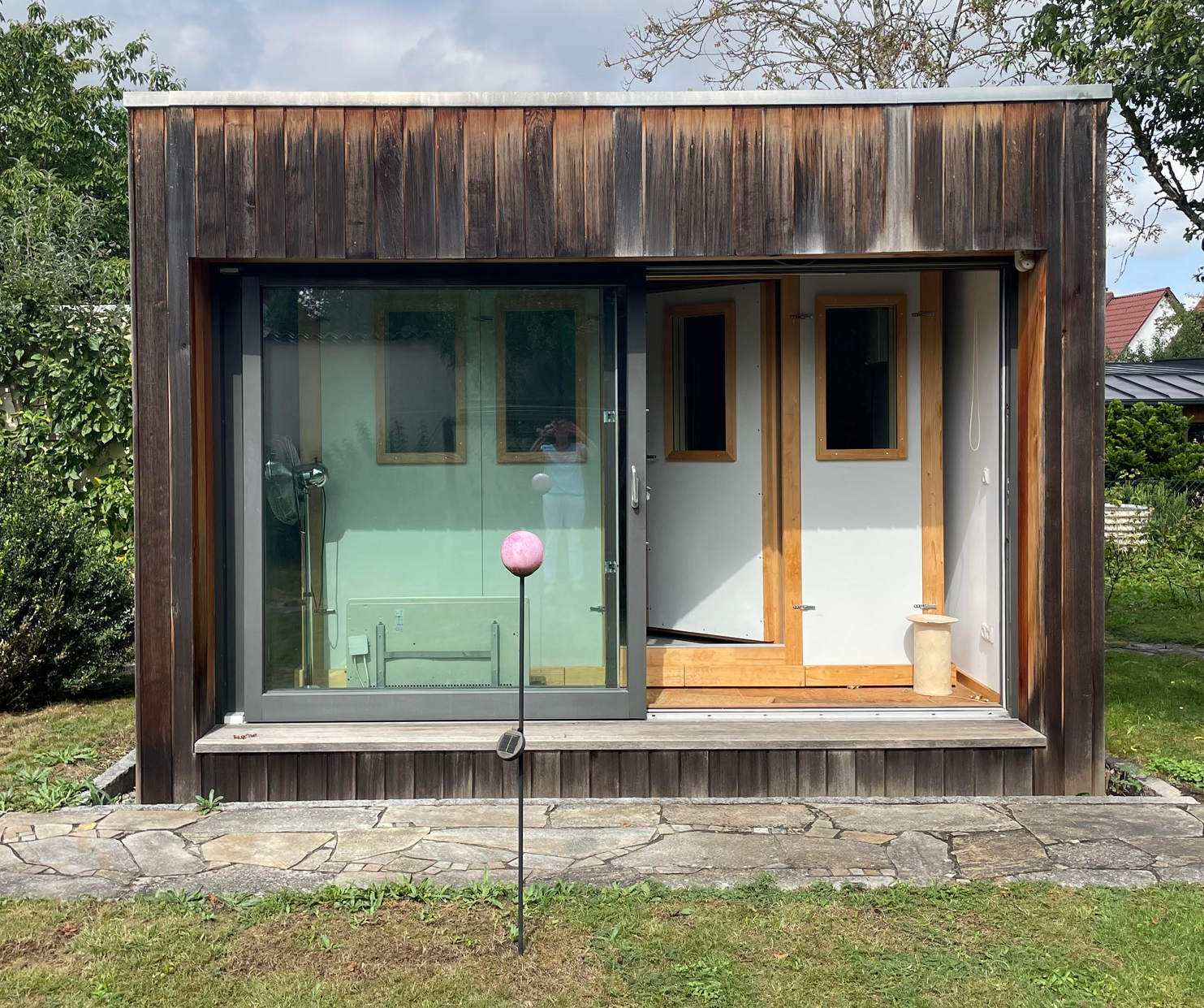 Dorothee Eberhardt-Lutz: Meinen bevorzugten Arbeitsplatz macht aus, dass er absolut schalldicht ist und ich von außen nichts höre. Ich arbeite daher in einem Gartenhaus mit schalldichter Box. In dieser sind ein Schreibtisch, ein Klavier, Noten, Bücher, CDs und CD-Spieler und je nachdem, für welche Instrumente ich komponiere, Geige, Cello, Klarinette, Flöte, Perkussionsinstrumente usw., einmal sogar ein Kontrabass, den ich ausgeliehen hatte. Was es in meiner Box nicht gibt, sind Telefon und Computer, d.h. es gibt, außer einen schönen Blick in den Garten und den Himmel, keinen Kontakt zur Außenwelt.