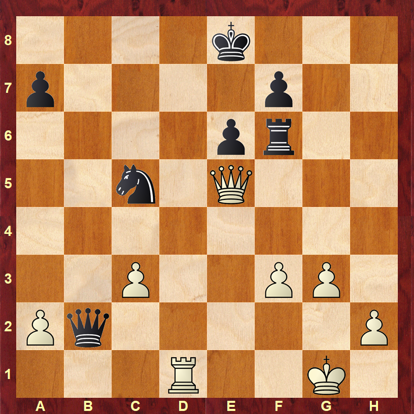 Die beste Fortsetzung in der Diagrammstellung war aber 44…Sh3+!. Nun scheitert 45.Kg2? offenkundig an 45…Txf2+ 46.Txf2 Dxf2+ 47.Dxf2 Sxf2 mit einem für Schwarz gewonnenen Bauernendspiel. Doch Weiß verfügt über die gifte Ressource 45.Dxh3!. Die Dame ist wegen 45…Txh3?? 46.Tc8+ Ke7 47.f8D+ und Matt tabu, 45…Tg3+? 46.Dxg3 Dxg3+ 47.Kf1 Dd3+= führt nur zum Dauerschach. Um zu gewinnen muss Schwarz kühlen Kopf bewahren und die Fortsetzung 45…Dxf2+! finden: 46.Txf2 Txh3 -+.