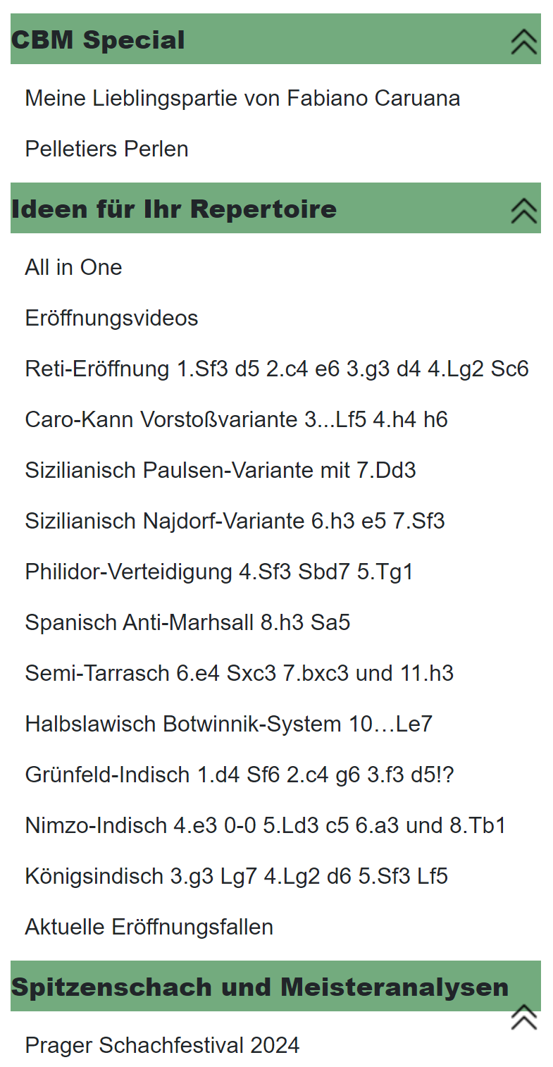 Einer der auch für Amateure instruktiven Content-Schwerpunkte sind die total ca. sechs Stunden Lern-Video’s, die teils interaktiv daherkommen und eine breite Palette an Schach-Themen und -Motiven abdecken. Den Anfang machen „Eröffnungs-Videos“ der Groß- bzw. Internationalen Meister Blohberger, Bauer und Zwirs zu den Englischen, Slawischen und Italienischen Komplexen, während sich der langjährige CBM-Autor GM Karsten Müller als Endspiel-Experte diesmal dem praxisrelevanten Ending „Springer gegen Bauer(n)“ widmet.