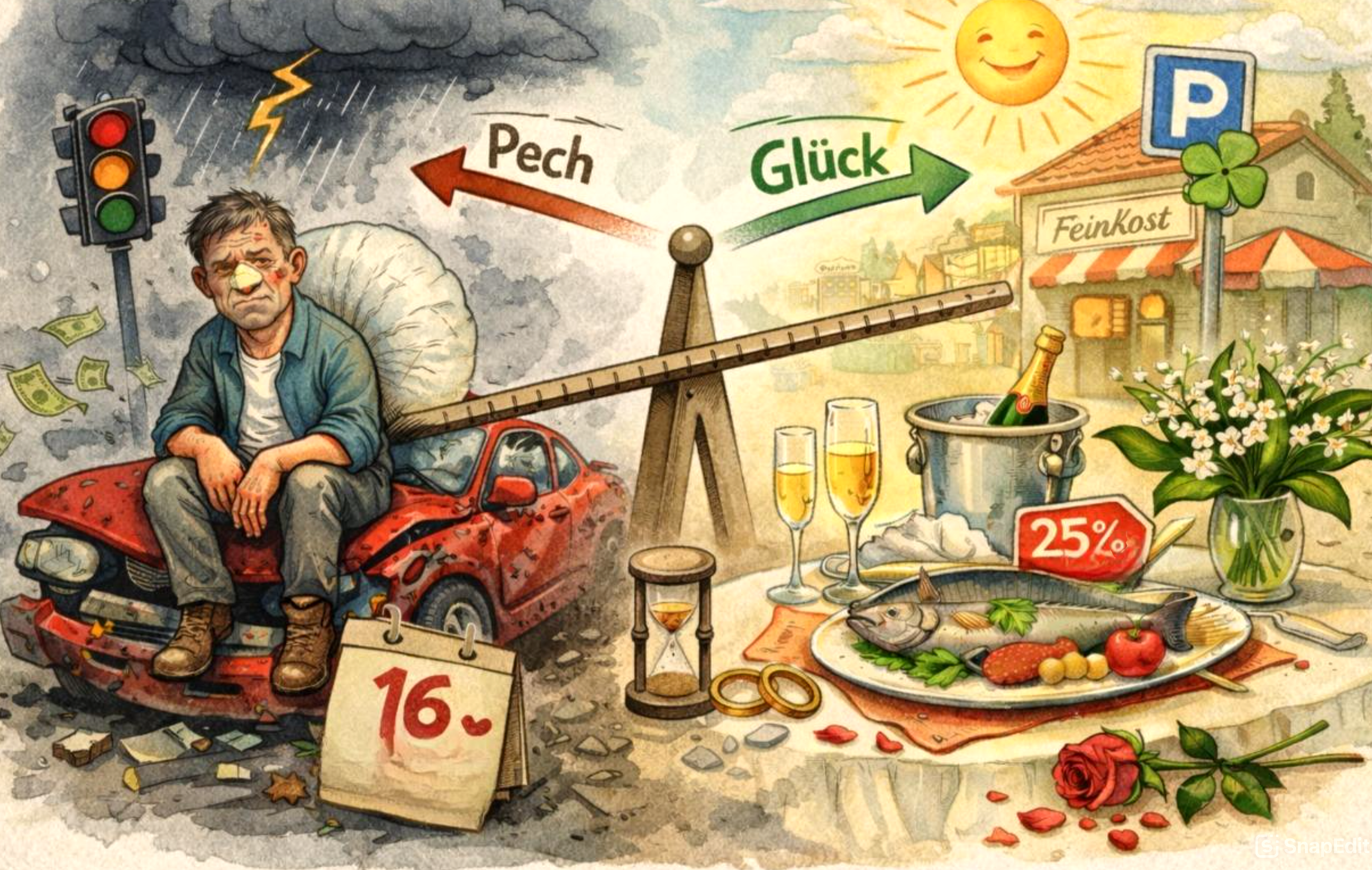 Was lernen wir daraus? Vielleicht, dass vollständiges Glück eine thermodynamische Unmöglichkeit darstellt. Sicher ist nur: Der Mittwoch von Günter und Lieselotte aus H. war ein lehrbuchmässiger Fall des unvermeidlichen Gleichgewichts zwischen Unglück und Glück im Alltag – oder, je nach Perspektive, ein Glück mit abruptem Verfallsdatum. ♦